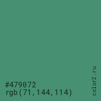Цвет #479072 в цветовой модели RGB обозначается тремя октетами (71, 144, 114) в десятичном формате и #479072 в шестнадцатиричном (hex) формате, которые являются интенсивностью красного 71 (hex 47), интенсивность зелёного 144 (hex 90) и интенсивность синего 114 (hex 72).