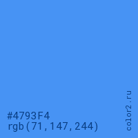 Цвет #4793F4 в цветовой модели RGB обозначается тремя октетами (71, 147, 244) в десятичном формате и #4793F4 в шестнадцатиричном (hex) формате, которые являются интенсивностью красного 71 (hex 47), интенсивность зелёного 147 (hex 93) и интенсивность синего 244 (hex F4).
