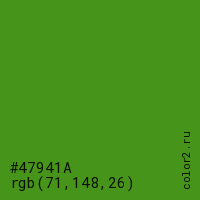Цвет #47941A в цветовой модели RGB обозначается тремя октетами (71, 148, 26) в десятичном формате и #47941A в шестнадцатиричном (hex) формате, которые являются интенсивностью красного 71 (hex 47), интенсивность зелёного 148 (hex 94) и интенсивность синего 26 (hex 1A).