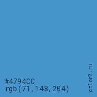 Цвет #4794CC в цветовой модели RGB обозначается тремя октетами (71, 148, 204) в десятичном формате и #4794CC в шестнадцатиричном (hex) формате, которые являются интенсивностью красного 71 (hex 47), интенсивность зелёного 148 (hex 94) и интенсивность синего 204 (hex CC).