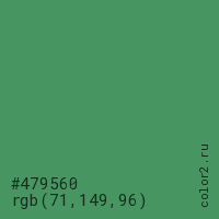 Цвет #479560 в цветовой модели RGB обозначается тремя октетами (71, 149, 96) в десятичном формате и #479560 в шестнадцатиричном (hex) формате, которые являются интенсивностью красного 71 (hex 47), интенсивность зелёного 149 (hex 95) и интенсивность синего 96 (hex 60).