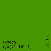 Цвет #479701 в цветовой модели RGB обозначается тремя октетами (71, 151, 1) в десятичном формате и #479701 в шестнадцатиричном (hex) формате, которые являются интенсивностью красного 71 (hex 47), интенсивность зелёного 151 (hex 97) и интенсивность синего 1 (hex 01).