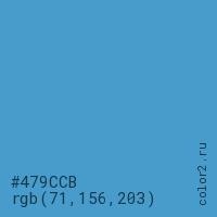 Цвет #479CCB в цветовой модели RGB обозначается тремя октетами (71, 156, 203) в десятичном формате и #479CCB в шестнадцатиричном (hex) формате, которые являются интенсивностью красного 71 (hex 47), интенсивность зелёного 156 (hex 9C) и интенсивность синего 203 (hex CB).