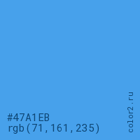 Цвет #47A1EB в цветовой модели RGB обозначается тремя октетами (71, 161, 235) в десятичном формате и #47A1EB в шестнадцатиричном (hex) формате, которые являются интенсивностью красного 71 (hex 47), интенсивность зелёного 161 (hex A1) и интенсивность синего 235 (hex EB).