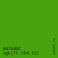 Цвет #47A40C в цветовой модели RGB обозначается тремя октетами (71, 164, 12) в десятичном формате и #47A40C в шестнадцатиричном (hex) формате, которые являются интенсивностью красного 71 (hex 47), интенсивность зелёного 164 (hex A4) и интенсивность синего 12 (hex 0C).