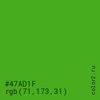 Цвет #47AD1F в цветовой модели RGB обозначается тремя октетами (71, 173, 31) в десятичном формате и #47AD1F в шестнадцатиричном (hex) формате, которые являются интенсивностью красного 71 (hex 47), интенсивность зелёного 173 (hex AD) и интенсивность синего 31 (hex 1F).