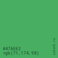 Цвет #47AE62 в цветовой модели RGB обозначается тремя октетами (71, 174, 98) в десятичном формате и #47AE62 в шестнадцатиричном (hex) формате, которые являются интенсивностью красного 71 (hex 47), интенсивность зелёного 174 (hex AE) и интенсивность синего 98 (hex 62).