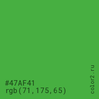 Цвет #47AF41 в цветовой модели RGB обозначается тремя октетами (71, 175, 65) в десятичном формате и #47AF41 в шестнадцатиричном (hex) формате, которые являются интенсивностью красного 71 (hex 47), интенсивность зелёного 175 (hex AF) и интенсивность синего 65 (hex 41).
