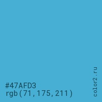 Цвет #47AFD3 в цветовой модели RGB обозначается тремя октетами (71, 175, 211) в десятичном формате и #47AFD3 в шестнадцатиричном (hex) формате, которые являются интенсивностью красного 71 (hex 47), интенсивность зелёного 175 (hex AF) и интенсивность синего 211 (hex D3).