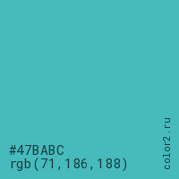 Цвет #47BABC в цветовой модели RGB обозначается тремя октетами (71, 186, 188) в десятичном формате и #47BABC в шестнадцатиричном (hex) формате, которые являются интенсивностью красного 71 (hex 47), интенсивность зелёного 186 (hex BA) и интенсивность синего 188 (hex BC).