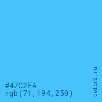 Цвет #47C2FA в цветовой модели RGB обозначается тремя октетами (71, 194, 250) в десятичном формате и #47C2FA в шестнадцатиричном (hex) формате, которые являются интенсивностью красного 71 (hex 47), интенсивность зелёного 194 (hex C2) и интенсивность синего 250 (hex FA).