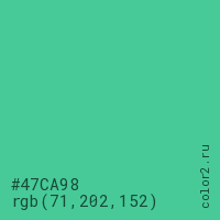 Цвет #47CA98 в цветовой модели RGB обозначается тремя октетами (71, 202, 152) в десятичном формате и #47CA98 в шестнадцатиричном (hex) формате, которые являются интенсивностью красного 71 (hex 47), интенсивность зелёного 202 (hex CA) и интенсивность синего 152 (hex 98).