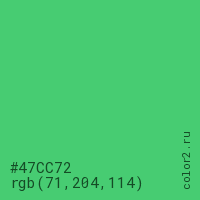 Цвет #47CC72 в цветовой модели RGB обозначается тремя октетами (71, 204, 114) в десятичном формате и #47CC72 в шестнадцатиричном (hex) формате, которые являются интенсивностью красного 71 (hex 47), интенсивность зелёного 204 (hex CC) и интенсивность синего 114 (hex 72).