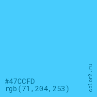 Цвет #47CCFD в цветовой модели RGB обозначается тремя октетами (71, 204, 253) в десятичном формате и #47CCFD в шестнадцатиричном (hex) формате, которые являются интенсивностью красного 71 (hex 47), интенсивность зелёного 204 (hex CC) и интенсивность синего 253 (hex FD).