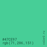 Цвет #47CE97 в цветовой модели RGB обозначается тремя октетами (71, 206, 151) в десятичном формате и #47CE97 в шестнадцатиричном (hex) формате, которые являются интенсивностью красного 71 (hex 47), интенсивность зелёного 206 (hex CE) и интенсивность синего 151 (hex 97).