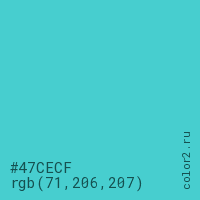 Цвет #47CECF в цветовой модели RGB обозначается тремя октетами (71, 206, 207) в десятичном формате и #47CECF в шестнадцатиричном (hex) формате, которые являются интенсивностью красного 71 (hex 47), интенсивность зелёного 206 (hex CE) и интенсивность синего 207 (hex CF).