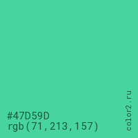 Цвет #47D59D в цветовой модели RGB обозначается тремя октетами (71, 213, 157) в десятичном формате и #47D59D в шестнадцатиричном (hex) формате, которые являются интенсивностью красного 71 (hex 47), интенсивность зелёного 213 (hex D5) и интенсивность синего 157 (hex 9D).