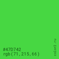Цвет #47D742 в цветовой модели RGB обозначается тремя октетами (71, 215, 66) в десятичном формате и #47D742 в шестнадцатиричном (hex) формате, которые являются интенсивностью красного 71 (hex 47), интенсивность зелёного 215 (hex D7) и интенсивность синего 66 (hex 42).