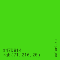 Цвет #47D814 в цветовой модели RGB обозначается тремя октетами (71, 216, 20) в десятичном формате и #47D814 в шестнадцатиричном (hex) формате, которые являются интенсивностью красного 71 (hex 47), интенсивность зелёного 216 (hex D8) и интенсивность синего 20 (hex 14).