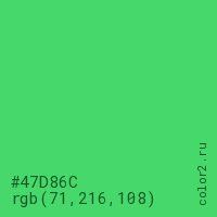 Цвет #47D86C в цветовой модели RGB обозначается тремя октетами (71, 216, 108) в десятичном формате и #47D86C в шестнадцатиричном (hex) формате, которые являются интенсивностью красного 71 (hex 47), интенсивность зелёного 216 (hex D8) и интенсивность синего 108 (hex 6C).
