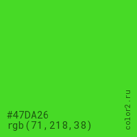 Цвет #47DA26 в цветовой модели RGB обозначается тремя октетами (71, 218, 38) в десятичном формате и #47DA26 в шестнадцатиричном (hex) формате, которые являются интенсивностью красного 71 (hex 47), интенсивность зелёного 218 (hex DA) и интенсивность синего 38 (hex 26).