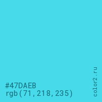 Цвет #47DAEB в цветовой модели RGB обозначается тремя октетами (71, 218, 235) в десятичном формате и #47DAEB в шестнадцатиричном (hex) формате, которые являются интенсивностью красного 71 (hex 47), интенсивность зелёного 218 (hex DA) и интенсивность синего 235 (hex EB).