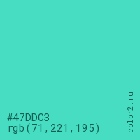 Цвет #47DDC3 в цветовой модели RGB обозначается тремя октетами (71, 221, 195) в десятичном формате и #47DDC3 в шестнадцатиричном (hex) формате, которые являются интенсивностью красного 71 (hex 47), интенсивность зелёного 221 (hex DD) и интенсивность синего 195 (hex C3).