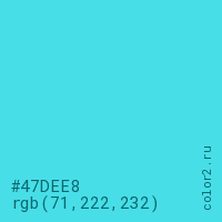 Цвет #47DEE8 в цветовой модели RGB обозначается тремя октетами (71, 222, 232) в десятичном формате и #47DEE8 в шестнадцатиричном (hex) формате, которые являются интенсивностью красного 71 (hex 47), интенсивность зелёного 222 (hex DE) и интенсивность синего 232 (hex E8).
