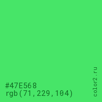 Цвет #47E568 в цветовой модели RGB обозначается тремя октетами (71, 229, 104) в десятичном формате и #47E568 в шестнадцатиричном (hex) формате, которые являются интенсивностью красного 71 (hex 47), интенсивность зелёного 229 (hex E5) и интенсивность синего 104 (hex 68).