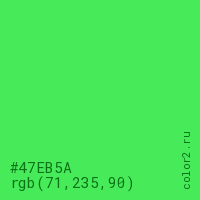 Цвет #47EB5A в цветовой модели RGB обозначается тремя октетами (71, 235, 90) в десятичном формате и #47EB5A в шестнадцатиричном (hex) формате, которые являются интенсивностью красного 71 (hex 47), интенсивность зелёного 235 (hex EB) и интенсивность синего 90 (hex 5A).