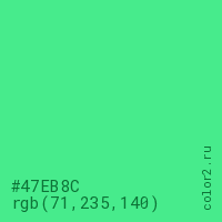 Цвет #47EB8C в цветовой модели RGB обозначается тремя октетами (71, 235, 140) в десятичном формате и #47EB8C в шестнадцатиричном (hex) формате, которые являются интенсивностью красного 71 (hex 47), интенсивность зелёного 235 (hex EB) и интенсивность синего 140 (hex 8C).