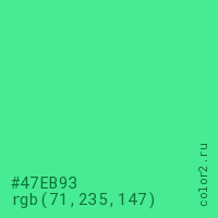 Цвет #47EB93 в цветовой модели RGB обозначается тремя октетами (71, 235, 147) в десятичном формате и #47EB93 в шестнадцатиричном (hex) формате, которые являются интенсивностью красного 71 (hex 47), интенсивность зелёного 235 (hex EB) и интенсивность синего 147 (hex 93).