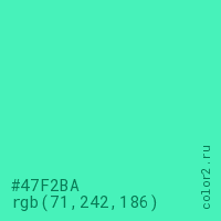 Цвет #47F2BA в цветовой модели RGB обозначается тремя октетами (71, 242, 186) в десятичном формате и #47F2BA в шестнадцатиричном (hex) формате, которые являются интенсивностью красного 71 (hex 47), интенсивность зелёного 242 (hex F2) и интенсивность синего 186 (hex BA).