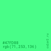 Цвет #47FD88 в цветовой модели RGB обозначается тремя октетами (71, 253, 136) в десятичном формате и #47FD88 в шестнадцатиричном (hex) формате, которые являются интенсивностью красного 71 (hex 47), интенсивность зелёного 253 (hex FD) и интенсивность синего 136 (hex 88).