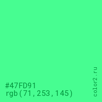Цвет #47FD91 в цветовой модели RGB обозначается тремя октетами (71, 253, 145) в десятичном формате и #47FD91 в шестнадцатиричном (hex) формате, которые являются интенсивностью красного 71 (hex 47), интенсивность зелёного 253 (hex FD) и интенсивность синего 145 (hex 91).