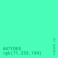 Цвет #47FDB8 в цветовой модели RGB обозначается тремя октетами (71, 253, 184) в десятичном формате и #47FDB8 в шестнадцатиричном (hex) формате, которые являются интенсивностью красного 71 (hex 47), интенсивность зелёного 253 (hex FD) и интенсивность синего 184 (hex B8).