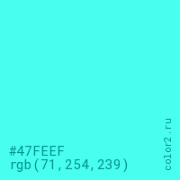 Цвет #47FEEF в цветовой модели RGB обозначается тремя октетами (71, 254, 239) в десятичном формате и #47FEEF в шестнадцатиричном (hex) формате, которые являются интенсивностью красного 71 (hex 47), интенсивность зелёного 254 (hex FE) и интенсивность синего 239 (hex EF).