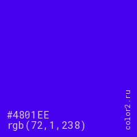 Цвет #4801EE в цветовой модели RGB обозначается тремя октетами (72, 1, 238) в десятичном формате и #4801EE в шестнадцатиричном (hex) формате, которые являются интенсивностью красного 72 (hex 48), интенсивность зелёного 1 (hex 01) и интенсивность синего 238 (hex EE).