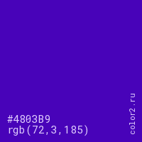 Цвет #4803B9 в цветовой модели RGB обозначается тремя октетами (72, 3, 185) в десятичном формате и #4803B9 в шестнадцатиричном (hex) формате, которые являются интенсивностью красного 72 (hex 48), интенсивность зелёного 3 (hex 03) и интенсивность синего 185 (hex B9).