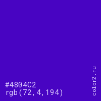 Цвет #4804C2 в цветовой модели RGB обозначается тремя октетами (72, 4, 194) в десятичном формате и #4804C2 в шестнадцатиричном (hex) формате, которые являются интенсивностью красного 72 (hex 48), интенсивность зелёного 4 (hex 04) и интенсивность синего 194 (hex C2).
