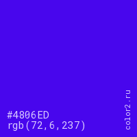 Цвет #4806ED в цветовой модели RGB обозначается тремя октетами (72, 6, 237) в десятичном формате и #4806ED в шестнадцатиричном (hex) формате, которые являются интенсивностью красного 72 (hex 48), интенсивность зелёного 6 (hex 06) и интенсивность синего 237 (hex ED).