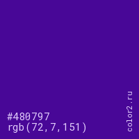 Цвет #480797 в цветовой модели RGB обозначается тремя октетами (72, 7, 151) в десятичном формате и #480797 в шестнадцатиричном (hex) формате, которые являются интенсивностью красного 72 (hex 48), интенсивность зелёного 7 (hex 07) и интенсивность синего 151 (hex 97).