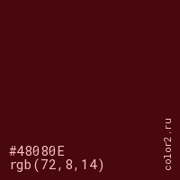 Цвет #48080E в цветовой модели RGB обозначается тремя октетами (72, 8, 14) в десятичном формате и #48080E в шестнадцатиричном (hex) формате, которые являются интенсивностью красного 72 (hex 48), интенсивность зелёного 8 (hex 08) и интенсивность синего 14 (hex 0E).