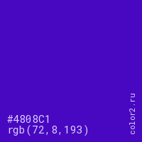 Цвет #4808C1 в цветовой модели RGB обозначается тремя октетами (72, 8, 193) в десятичном формате и #4808C1 в шестнадцатиричном (hex) формате, которые являются интенсивностью красного 72 (hex 48), интенсивность зелёного 8 (hex 08) и интенсивность синего 193 (hex C1).