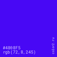 Цвет #4808F5 в цветовой модели RGB обозначается тремя октетами (72, 8, 245) в десятичном формате и #4808F5 в шестнадцатиричном (hex) формате, которые являются интенсивностью красного 72 (hex 48), интенсивность зелёного 8 (hex 08) и интенсивность синего 245 (hex F5).