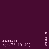 Цвет #480A31 в цветовой модели RGB обозначается тремя октетами (72, 10, 49) в десятичном формате и #480A31 в шестнадцатиричном (hex) формате, которые являются интенсивностью красного 72 (hex 48), интенсивность зелёного 10 (hex 0A) и интенсивность синего 49 (hex 31).
