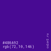 Цвет #480A92 в цветовой модели RGB обозначается тремя октетами (72, 10, 146) в десятичном формате и #480A92 в шестнадцатиричном (hex) формате, которые являются интенсивностью красного 72 (hex 48), интенсивность зелёного 10 (hex 0A) и интенсивность синего 146 (hex 92).