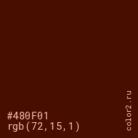 Цвет #480F01 в цветовой модели RGB обозначается тремя октетами (72, 15, 1) в десятичном формате и #480F01 в шестнадцатиричном (hex) формате, которые являются интенсивностью красного 72 (hex 48), интенсивность зелёного 15 (hex 0F) и интенсивность синего 1 (hex 01).