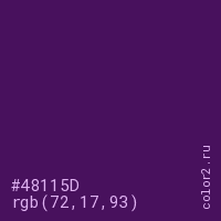 Цвет #48115D в цветовой модели RGB обозначается тремя октетами (72, 17, 93) в десятичном формате и #48115D в шестнадцатиричном (hex) формате, которые являются интенсивностью красного 72 (hex 48), интенсивность зелёного 17 (hex 11) и интенсивность синего 93 (hex 5D).