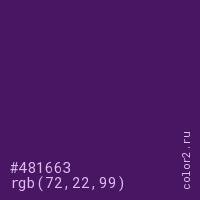Цвет #481663 в цветовой модели RGB обозначается тремя октетами (72, 22, 99) в десятичном формате и #481663 в шестнадцатиричном (hex) формате, которые являются интенсивностью красного 72 (hex 48), интенсивность зелёного 22 (hex 16) и интенсивность синего 99 (hex 63).